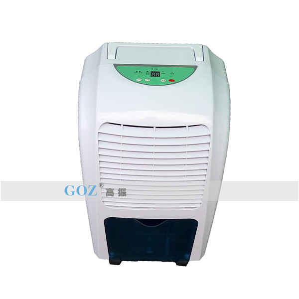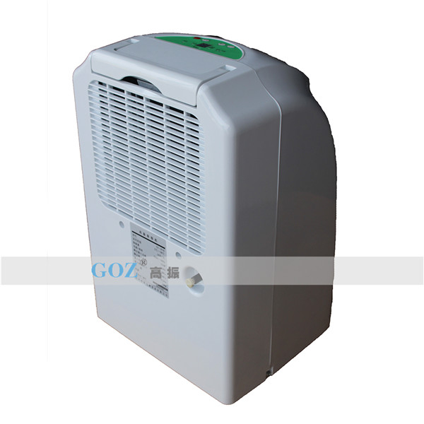 高振商用除濕機通過風機將潮濕空氣抽入機器內(nèi)部,通過壓縮機制冷將蒸發(fā)器降溫至露點以下,潮濕空氣經(jīng)過蒸發(fā)器在表面凝結(jié)成水,匯集至接水盤后,流入水箱中,干爽空氣經(jīng)冷凝器重新加熱由出風口排出,這樣不斷循環(huán)將室內(nèi)濕度降低。